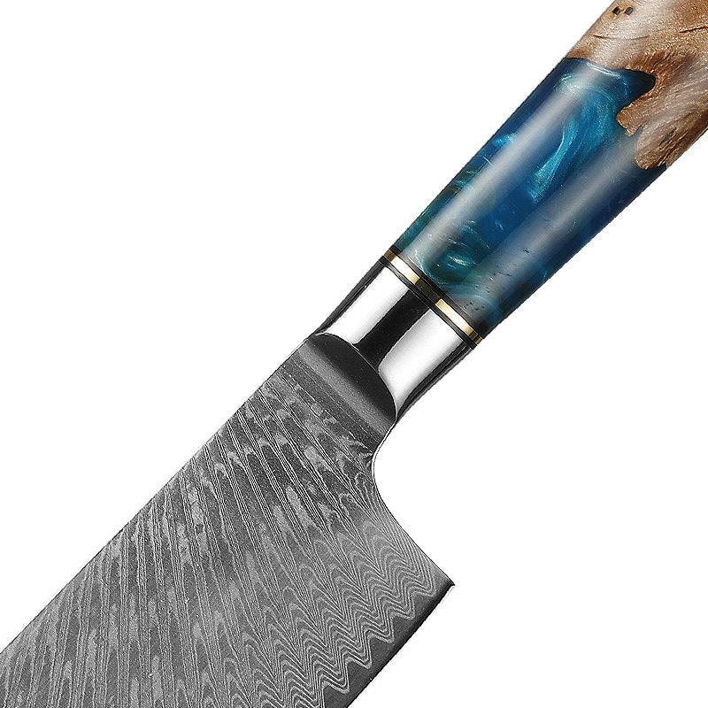 Cuchillo japonés Nakiri de Damasco con mango de resina azul de 7 "