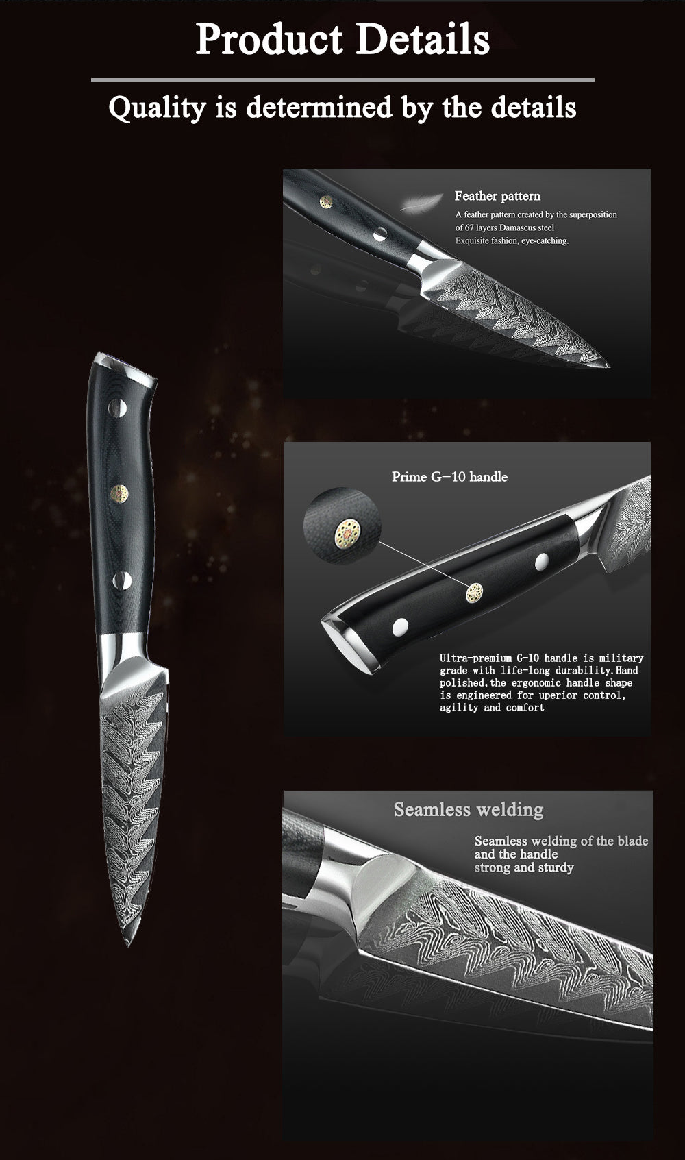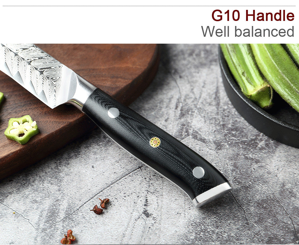 The knives are handcrafted for beauty, function and exceptional performance. Each blade features a Japanese VG10 core surrounded by 33 layers of Damascus steel to create a beautiful layered Damascus pattern. Finished with a G10 composite handle for ultimate comfort and durability with traditional mosaic pins and end caps.