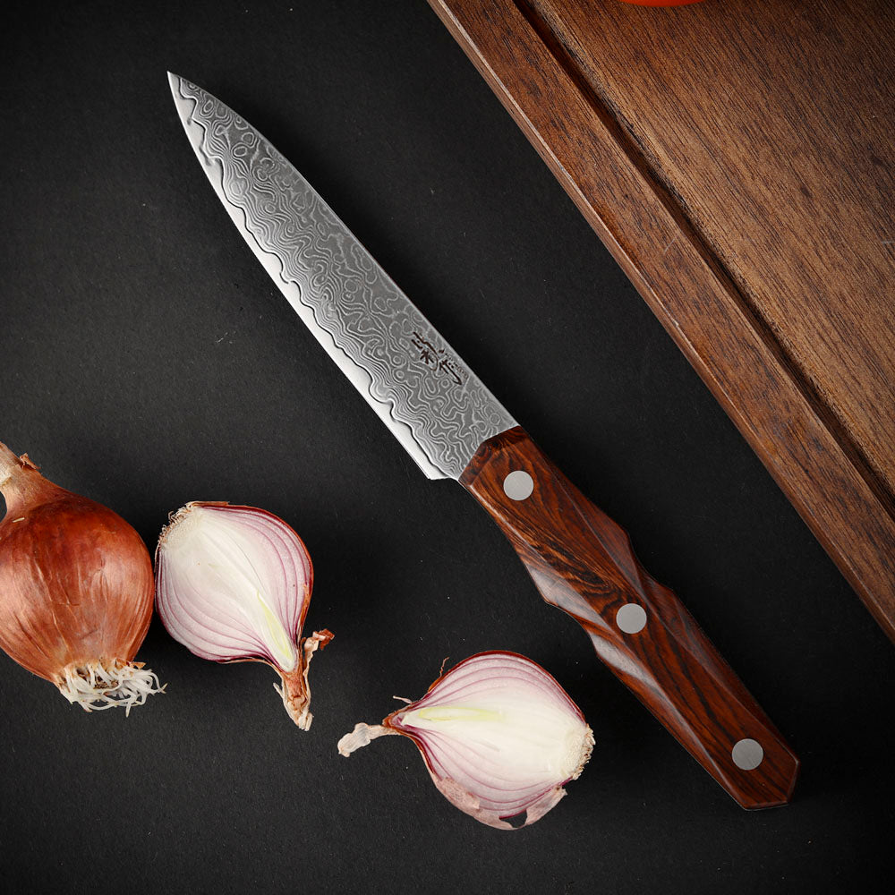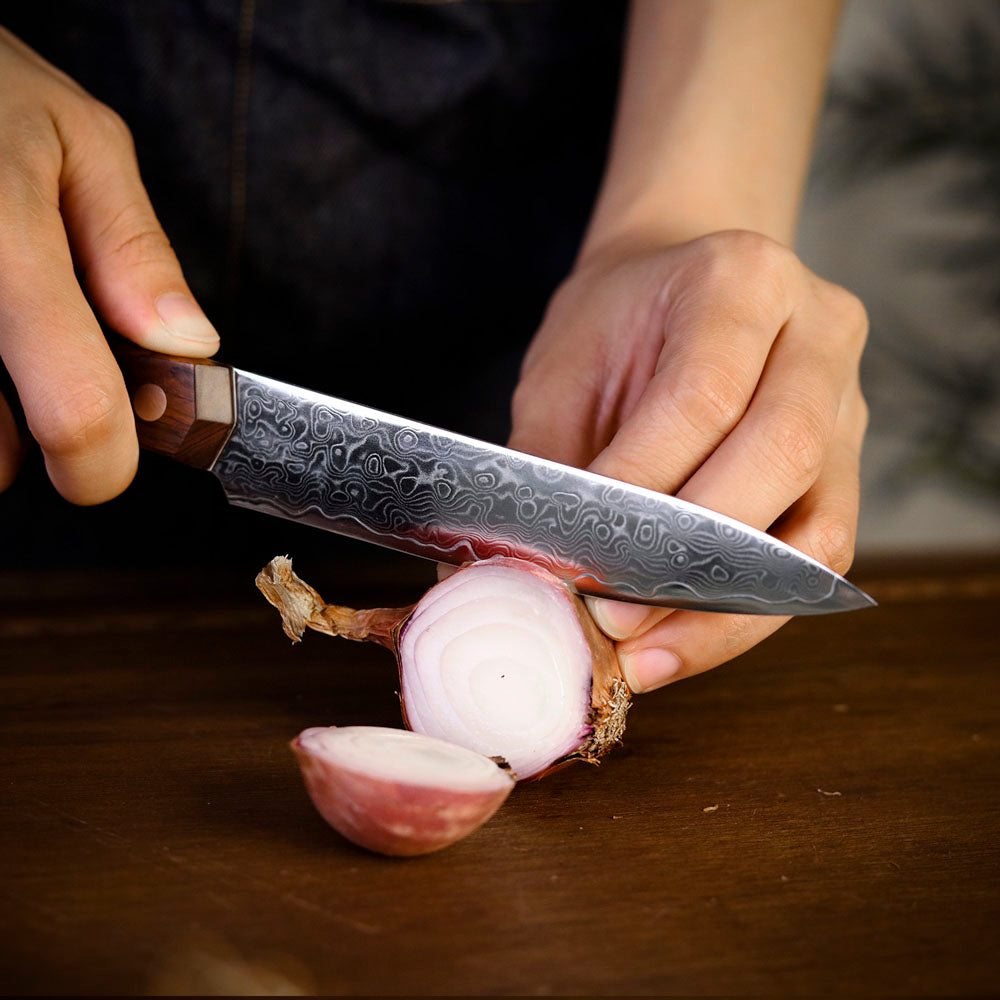 This Utility knife features a 10Cr15Mov steel core that's hammered to create a 67-layer Damascus pattern. 10Cr15Mov is one of the best stain-resistant steels for blades, giving this knife excellent cutting edge and edge retention.